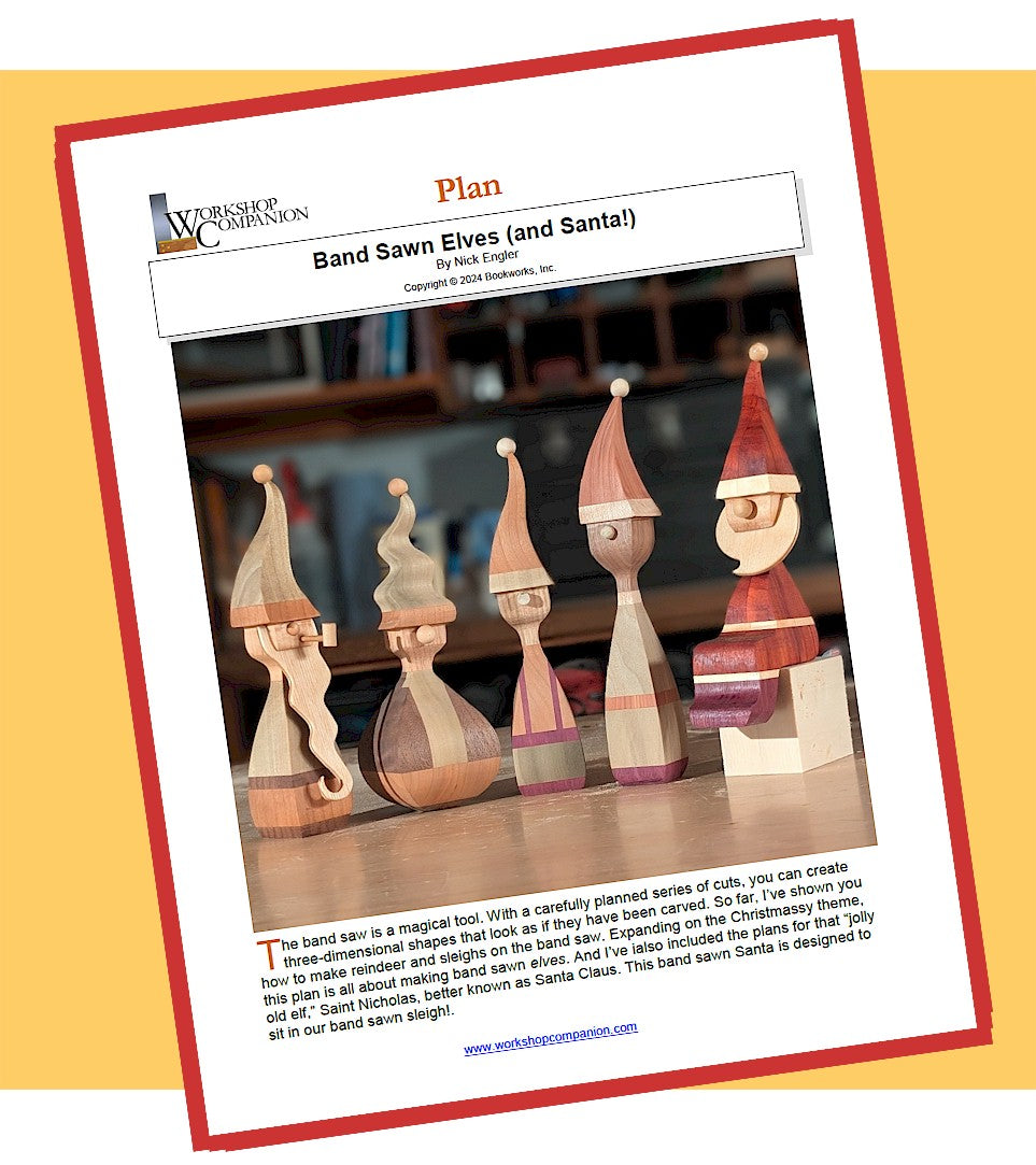 The band saw is a magical tool. With a carefully planned series of cuts, you can create three-dimensional shapes that look as if they have been carved by hand. Elsewhere in this store, Nick shows how to create three-dimensional reindeer and sleighs using a little band saw magic. Expanding on the Christmassy theme -- and keeping with the same tool --, this plan is all about making band sawn elves. And Nick has also included patterns for for making that “jolly old elf," himself Santa Claus. This band sawn Santa will sit in our band sawn sleigh!. 23 pages in PDF format, including step-by-step instructions, full-size patterns for elves and Santa, and measurements in both English/Imperial and Metric units.