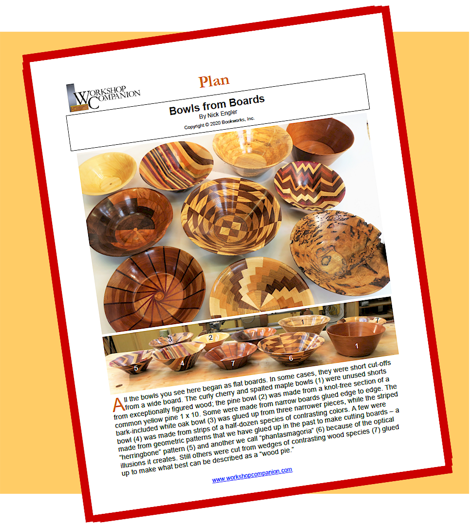 Nick shows you how to make a deep bowl from a flat board -- it's an extraordinary technique that saves you both time and money when turning bowls. All you need is a simple jig for your band saw that turns the boards into rings. Glue up the rings to form a rough bowl shape, then turn the shape on a lathe. But what makes this technique so remarkable is not its economy, but the possibilities it opens up. The boards don't have to be plain. They can be marvelously figured or intricately patterned, and their beauty will only be magnified when you reassemble them as a bowl. 16 pages in PDF format, step-by-step instructions, and plans for the necessary fixtures in both English and metric measurements. As a BONUS, you also get Nick's "Ring Calculator" to effortlessly figure angles and dimensions, and the plans for his popular Assembly Table -- an amazingly versatile clamping jig for gluing up wood assemblies. Important Note: The plans/instructions for the bowls and the assembly table are in PDF format, while the Ring Calculator is an XLS file that will run of most spreadsheet apps and programs, such as Excel, Worksheet, and Numbers.