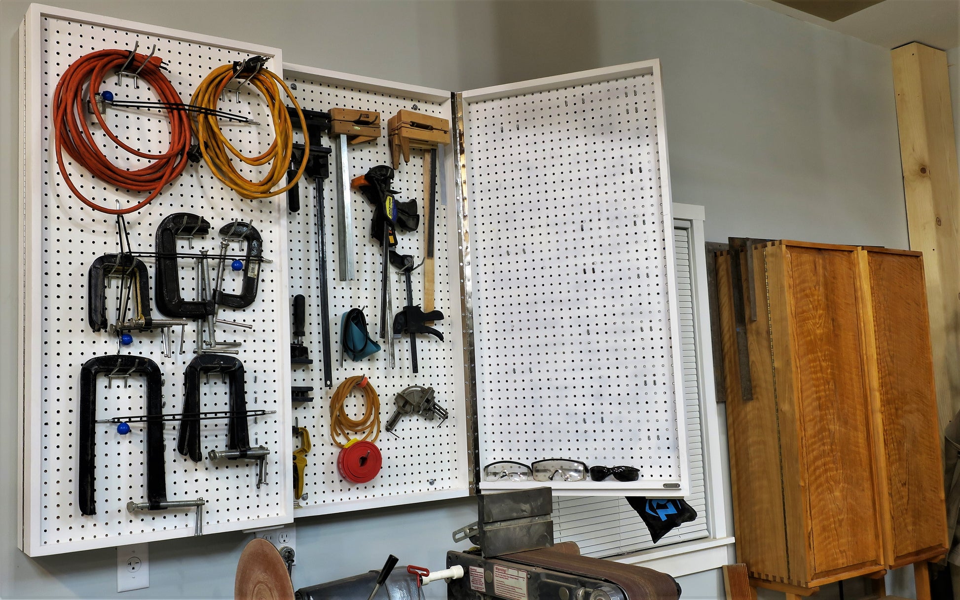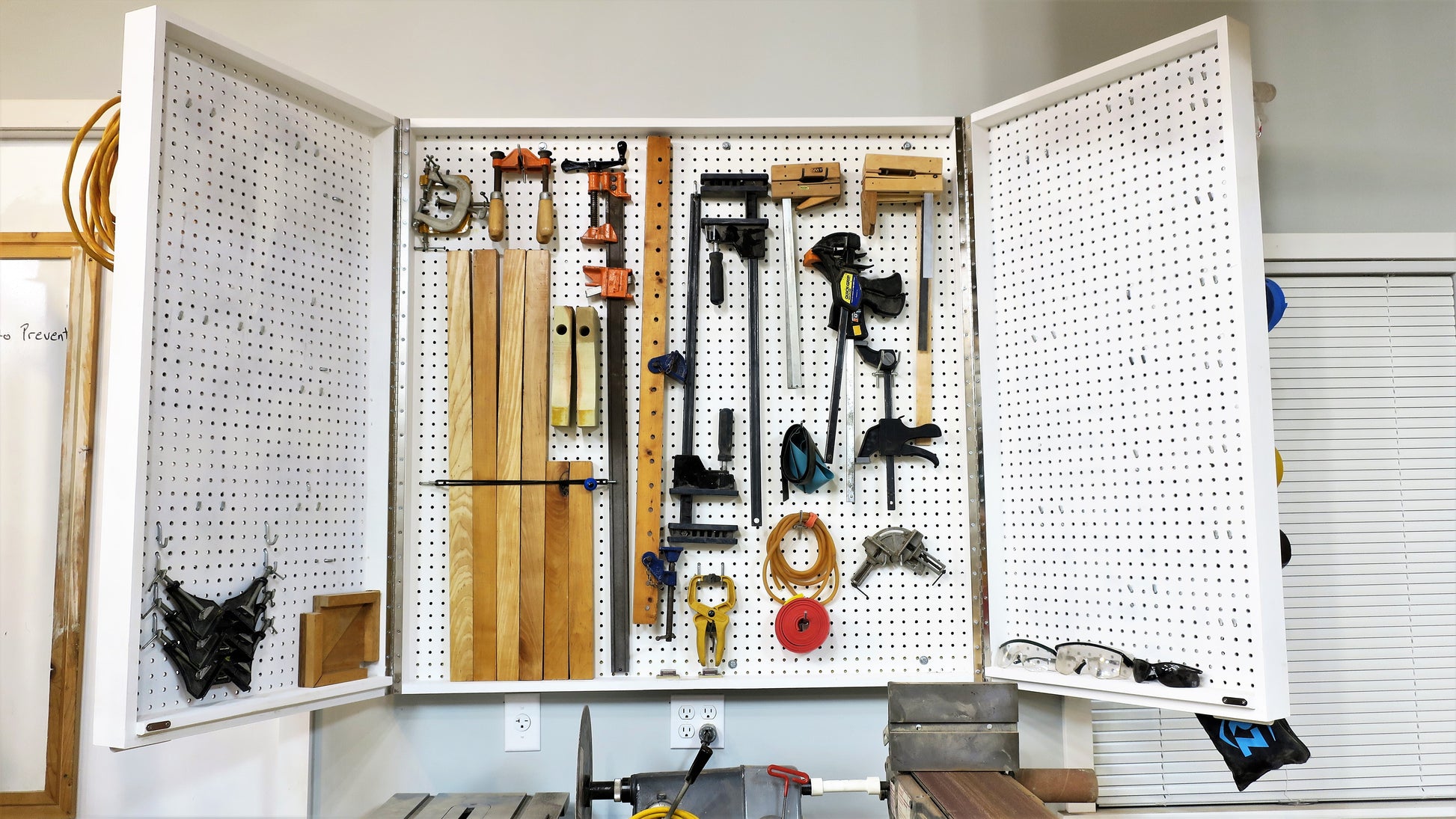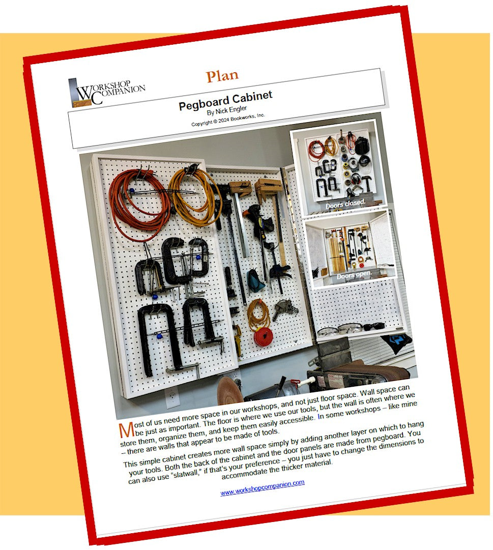 Need more wall space to store and organize your tools? In this plan, Nick shows how to build and install a unique storage cabinet that features pegboard panels both inside and out. This enables you to hang twice as many tools in the same vertical space! The design is easily adjustable to fit your shop, and it will accommodate many types and sizes of tools. Worried about weight? The cabinet attaches directly to a wall frame at both the top and bottom to help transfer the weight of the tools to the building. Additionally, an ingenious "lip" on both of the cabinet doors keeps them from sagging no matter how heavy the tools are. 10 pages in PDF format, step-by-step instructions, and detailed drawings with both Imperial and metric measurements.