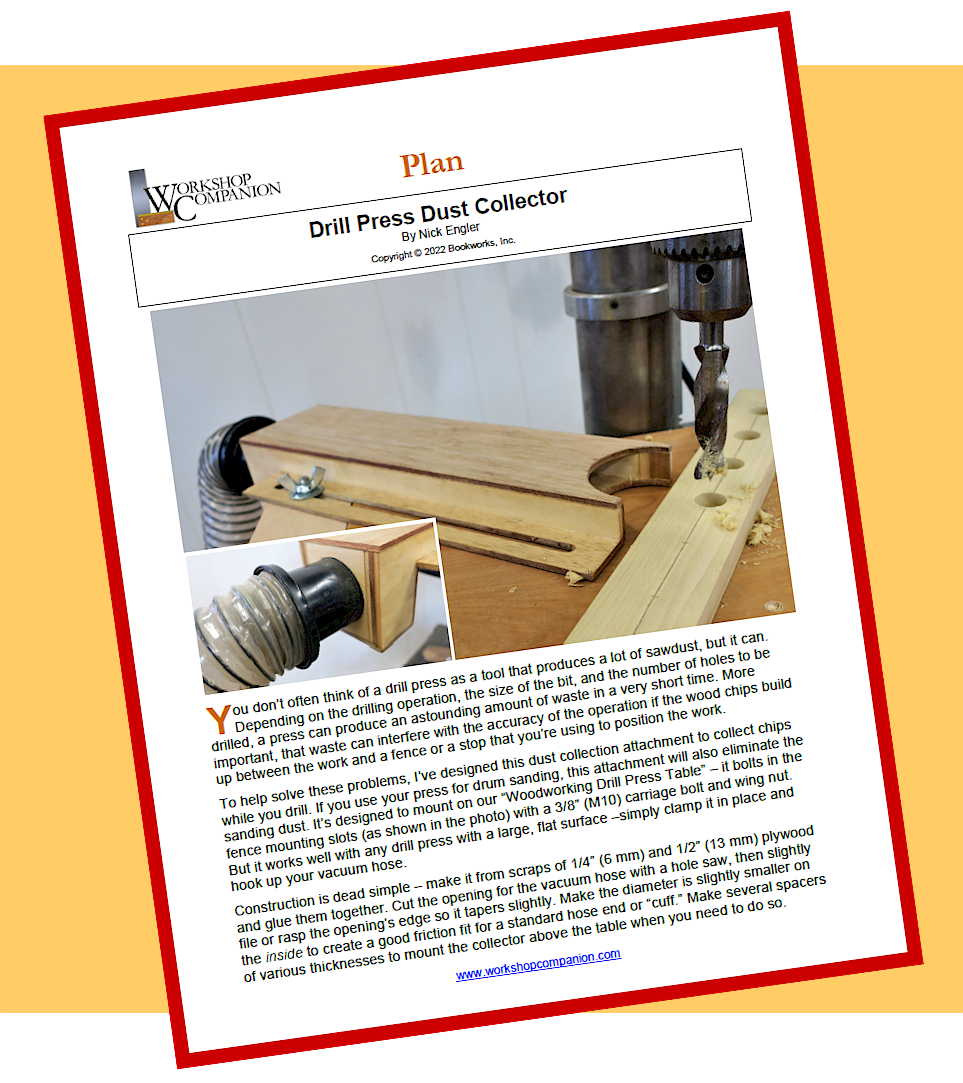 This quick-and-easy to build jig will collect sawdust when attached to your drill press. Attach it in an endless variety of positions and locations using bolts or clamps, and then attach a vacuum hose. It will work with most types of drills, countersinks, tenon and plug makers, hole saws, even drum sanders. It accepts many different sizes of standard vacuum hose cuffs. 3 pages in PDF format with detailed drawings in both English/Imperial and metric measurements.