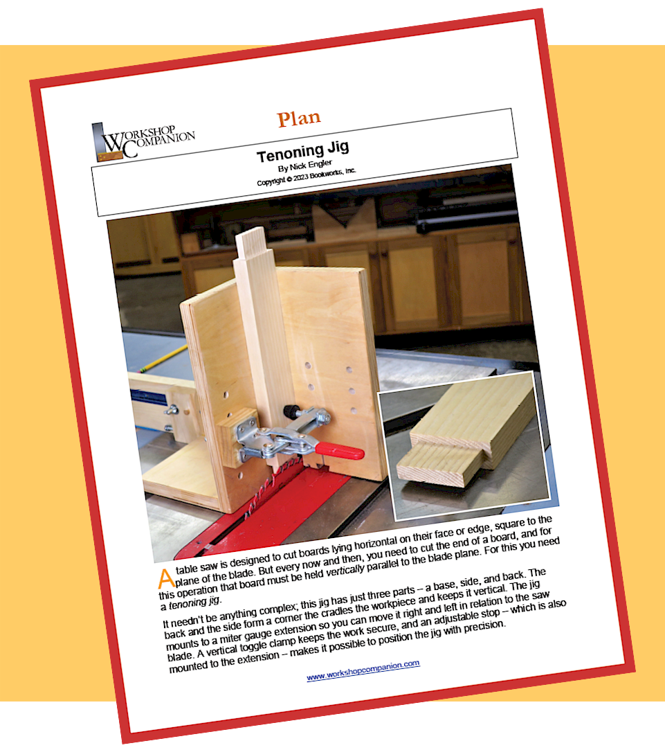A table saw is designed to cut boards lying horizontal on their face or edge, square to the plane of the blade. But every now and then, you need to cut the end of a board, and for this operation that board must be held vertically parallel to the blade plane. For this you need a tenoning jig. It needn’t be anything complex; this jig has just three parts – a base, side, and back. But simplicity doesn't mean it's imprecise -- Nick has added a micro-adjustable stop that works in concert with the jig to produce amazing accuracy. 8 pages in PDF format, step-by-step instructions, plus detailed drawings and materials lists in both English/Imperial and metric measurements.