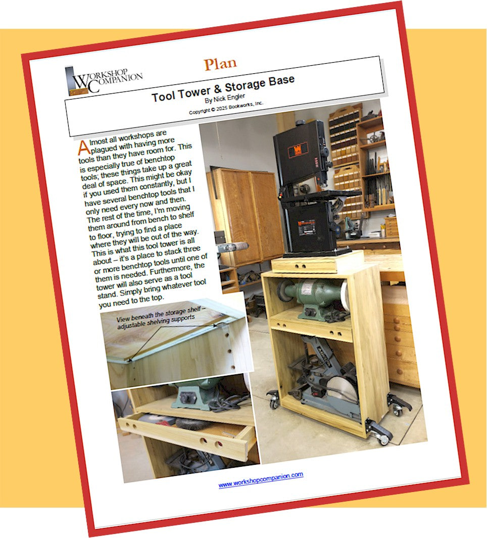 This tool tower features a unique "storage shelf" -- a combination of shelf and drawer that can be easily repositioned to accommodate your evolving selection of benchtop tools. With a modest design change, this shelf can become a "storage base" for you benchtop tools, helping to keep accessories at hand. 11 pages, step-by-step directions, and dimensions in both Imperial and metric.