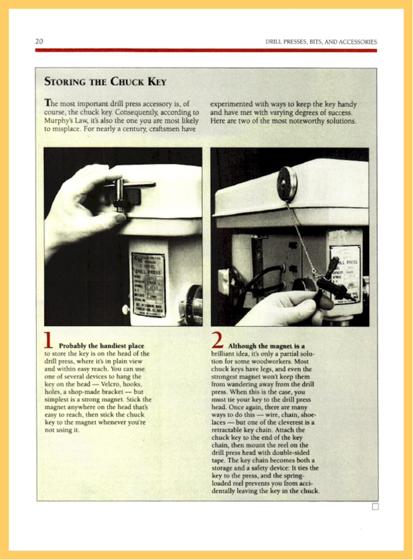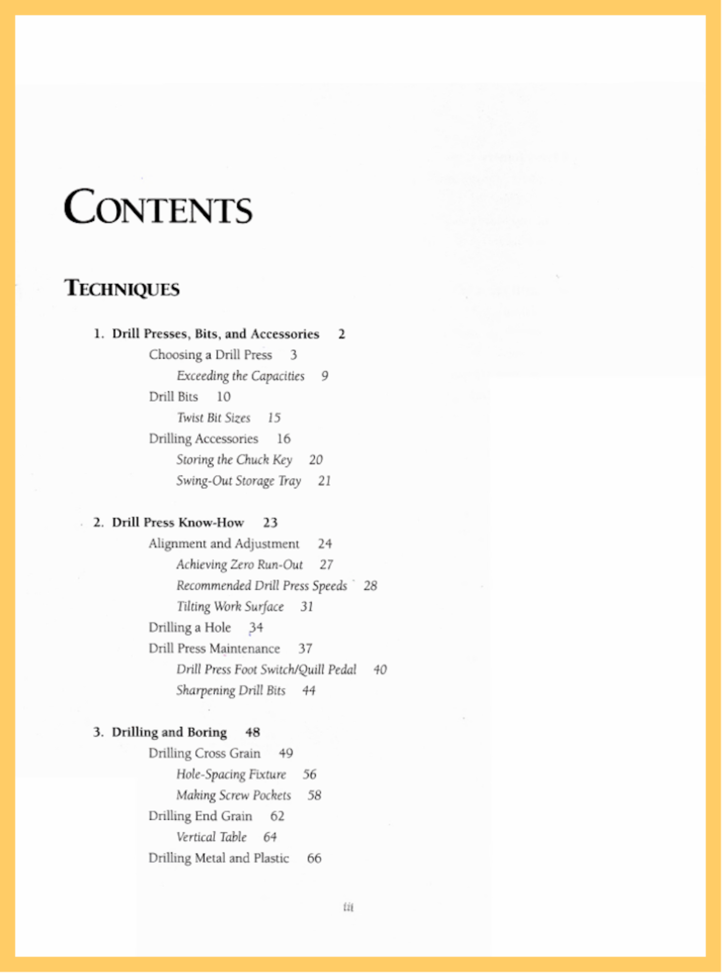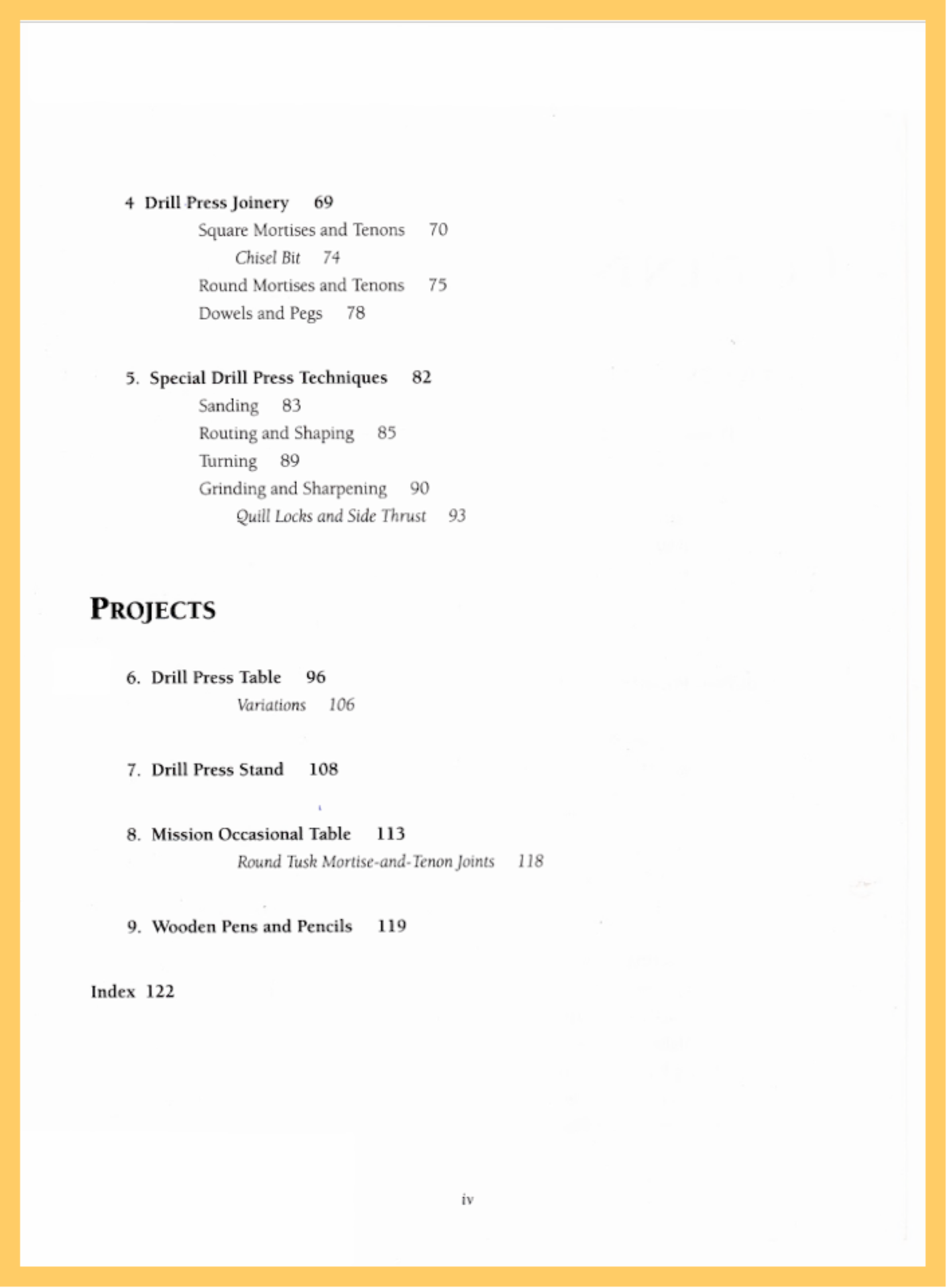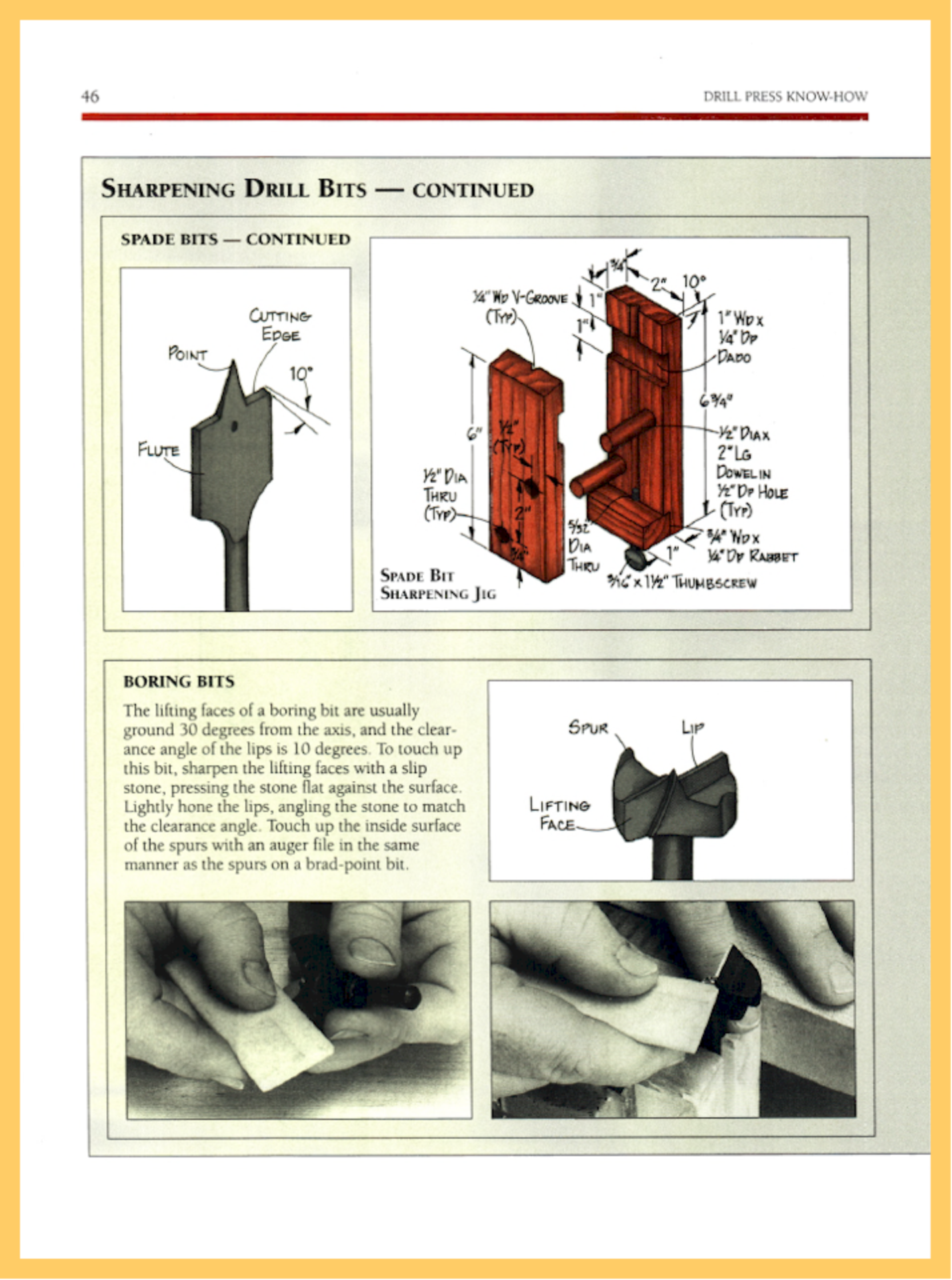 The drill press affords ease and accuracy when making holes, but it will do so much more. Nick explains which drill bits are best suited for wood and how to match the drill press speed to the bit. He shows how to square the bit to the table, minimize run-out and tear-out, drill both face and end grain. There are tips drilling round stock, angled holes, and square mortises, as well as jigs for sharpening bits, collecting sawdust, even using your drill press as a lathe to turn small parts. Four complete project plans show how to make a tilting Drill Press Table, Drill Press Storage Stand, Mission-Style Occasional Table, and Wooden Pens and Pencils. 128 pages, over 300 illustrations and photos in PDF format.